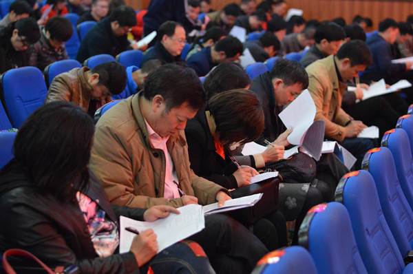 上图为闭幕式现场代表们填写民主测评表 孙立青摄