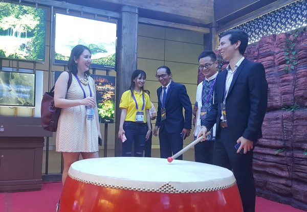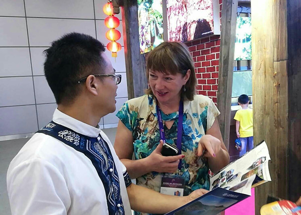 湘西展馆以“神秘湘西”为主题,将生态地质环境与少数民族文化创新结合,通过摄影作品和矿石标本,展示湘西多彩的人文历史、美丽的自然景观和珍贵的地质遗迹,吸引了国内外参观者驻足欣赏。奉红平老师担任外事翻译期间,向来自美国、俄罗斯、德国、加拿大、南非、乌克兰、巴基斯坦等国家的外籍参观者,介绍了湘西馆的主要构成、特色亮点以及湘西少数民族文化,以良好的专业素养和热情亲切的服务赢得了一致好评。