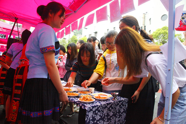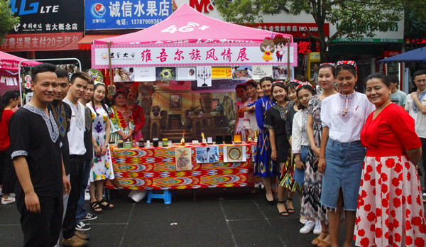 游园会活动集歌舞表演、美食制作、民族文化介绍、趣味游戏于一体。展棚处悬挂着民族概况、饮食、传统节日、风俗习惯等相关资料供游人学习。包括藏族、回族、土家族在内的10个少数民族均以欢愉有趣的形式展示本民族特色文化,使参与者感受各民族缤纷多彩文化的魅力。这其中,维吾尔族优美曼妙的舞蹈、鲜嫩可口的肉串、巧夺天工的乐器;藏族栩栩如生的挂画、独具一格的服饰、齿颊留香的酥油茶、苗族的银饰、土家族的油茶汤、满族的民族服饰全体验、蒙古族的特色工艺品,瑶族的特色习俗,回族的盖碗茶……活动现场,中华传统技艺及美食文化数不胜数、目不暇接。多姿多彩的民族文化及展演形式令观众叹为观止,堪称一场民族文化盛宴。穿着民族特色服饰的姑娘、小伙们,热情地为同学们介绍着家乡人文风俗,使大家身临其境地感受到了民族文化的魅力。