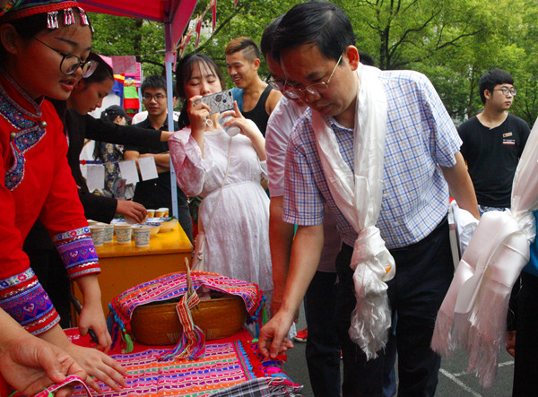 图为壮族姑娘向黄昕副校长展示布料 钟兆铭摄