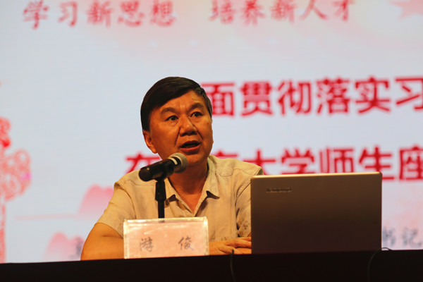本网讯(记者见闻 学生记者刘群)为全面贯彻落实习近平总书记在今年五四青年节前夕在北京大学师生座谈会上的重要讲话精神, 6月15日下午,awc777万象城娱乐官网党委书记游俊在砂子坳校区演奏厅为来自全校各学院的600余名师生代表讲授《学习新思想,培养新人才——全面贯彻落实习近平总书记在北京大学师生座谈会上的重要讲话》。
