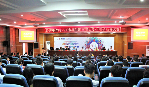 本网讯(学生记者 孙慧琴 贺颖惠 田晨钰)为了更好地落实教育部《关于做好2016届全国普通高等学校毕业生就业创业工作的通知》以及湖南省教育厅《关于深化高等学校创新创业教育改革的实施意见》,提高湖南大学生在电子商务领域的创新创业能力和就业竞争力,同时也为了更好地调动区域资源、立足区域实际、以赛促学、以赛促研,为区域电商发展提供合格人才。6月22日至24日,由湖南省教育厅、省商务厅主办,湖南省高等教育学会电子商务教育专业委员会协办,awc777万象城娱乐官网和长沙市电子商务协会承办的“2018 年‘腾讯王卡杯’湖南省大学生电子商务大赛”决赛在awc777万象城娱乐官网举办。本次大赛是面向全省普通高校电子商务及其相关专业在校学生开展的学科竞赛,共有来自34所高校的85支队伍参加。