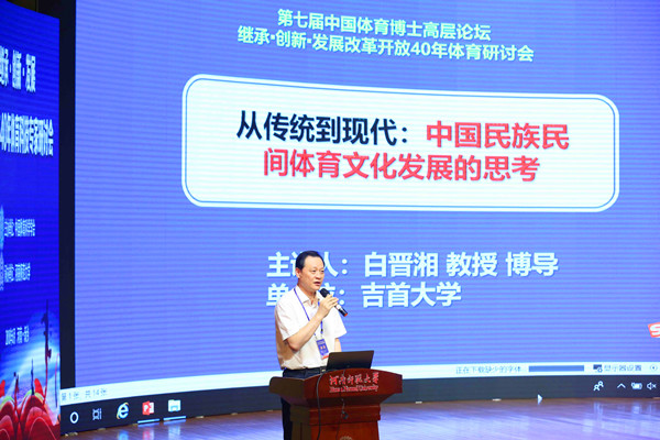 本网讯 6月28日—30日,由中国体育科学学会主办、河南师范大学承办的“第七届中国体育博士高层论坛”暨“‘继承•创新•发展——改革开放’40年体育科技专家研讨会”在河南新乡举行。万象城官网党委副书记、校长白晋湘教授作为受邀专家出席了本次大会,并在大会上作了《从传统到现代:中国民族民间体育文化发展的思考》的报告,报告中白晋湘回顾了改革开放40年来中国民族民间体育文化发展取得的成绩和不足,展望了未来中国民族民间体育文化发展的方向和目标。