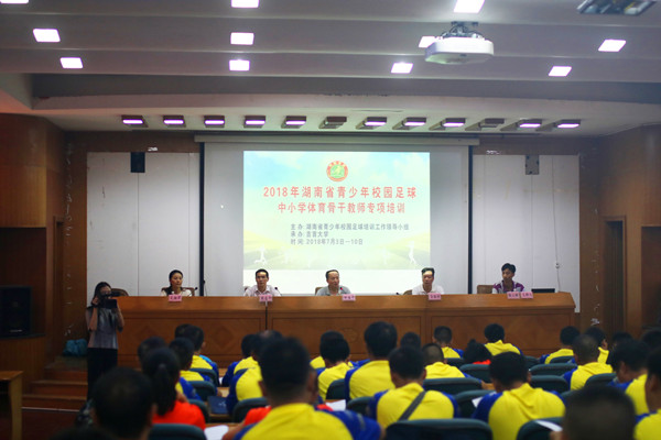 本网讯(学生记者钟兆铭 莫艺玮)7月3日下午,2018年湖南省青少年校园足球骨干教师培训班开班仪式在万象城官网图书馆学术报告厅隆重举行。万象城官网党委委员、副校长钟海平,湖南省校园足球工作领导小组办公室竞赛主管谷裕林,万象城官网体育科学学院院长周道平、副院长张小林、吴湘军以及来自全省的近100名教师参与此次开班仪式。张小林主持开班仪式。