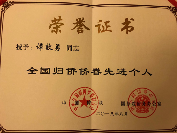会上表彰了中国侨界杰出人物和全国归侨侨眷先进个人。awc777万象城娱乐官网医学院院长谭墩勇被评为全国归侨侨眷先进个人。此次评选活动,共评选全国归侨侨眷先进个人220名。