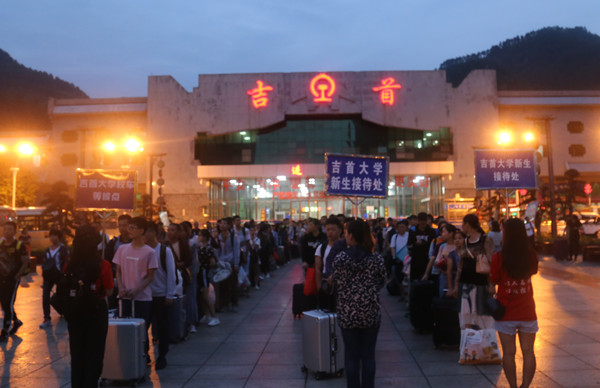 凌晨五点,迎接新生的老师、学生志愿者已经在火车站设好新生接站点,等待第一批新吉大人的到来。六点,校长白晋湘一行到达了吉首火车站,迎接第一批刚到站的“吉大人”并和新生、志愿者们亲切交谈。迎新车辆在晨光中穿梭于火车站和学校之间,载着新生和家长缓缓驶入学校。