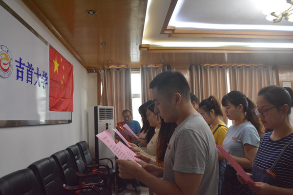 本次表彰大会的主题是“弘扬高尚师德,潜心立德树人”。会议在庄严的国歌声中揭开序幕,王晓彤宣读了2018年新入职教师名单后,新教师入职宣誓仪式正式开始,由大汉奖教基金优秀教师代表唐纯翼领誓,新入职教师面对国旗庄严宣誓。