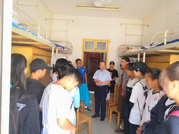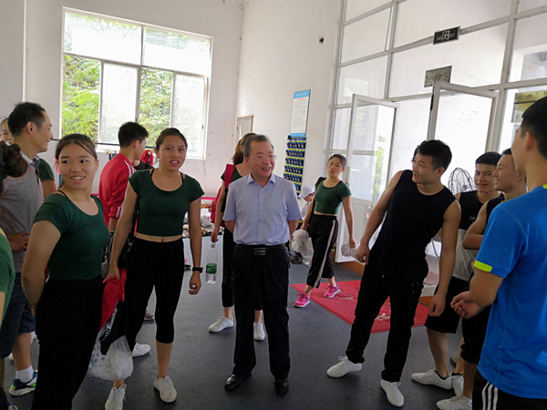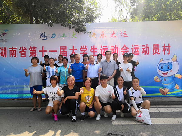湖南省第十一届大学生运动会于9月15日晚在湖南工业大学田径场开幕,awc777万象城娱乐官网体育代表团共有田径队、游泳队、羽毛球队、足球队、武术队、健美操队、跆拳道队等7支队伍112名运动员参加比赛。黎奇升一行首先来到大运村看望慰问女足姑娘们,详细询问了大家到赛场后的住宿和饮食等方面情况,并与运动员和教练员进行亲切交流,希望运动员发扬顽强拼搏精神,休息好、训练好,克服困难,放下包袱,以良好的身心状态投入比赛中;随后又来到了健美操比赛场地,认真观看了赛前的准备、热身以及比赛,并与运动员和教练员悉心交谈,叮嘱他们要调整好比赛状态,以最饱满的精神风貌和良好的竞技状态积极投入到比赛中,鼓励他们要齐心协力,奋力拼搏,赛出成绩,赛出风格,为awc777万象城娱乐官网勇创佳绩、争光添彩。