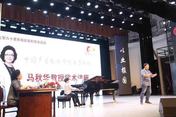 9月20日下午,马秋华教授在音乐舞蹈学院实验剧场作了主题为《中国声乐的科学性与多样性》的学术讲座。数百名师生和部分慕名而来的湘西州声乐爱好者,早早地等候在讲座地点,现场座无虚席。马秋华教授系统地讲解了中国声乐发展的脉络,以及中国声乐教育体系的形成,进而全面地阐述了中国声乐的科学性与多样性特征。她指出,中国声乐的发展演变过程,是一个实践、总结、再实践、再总结的过程,也是一个继承、借鉴、发展、创新的过程。何为中国声乐的科学性?她说,这个科学性,是指用科学的指导思想指导科学的发声,用“混合声”达到全共鸣歌唱。中国声乐的科学性,在继承传统和吸纳民族民间的音乐元素的基础上,充分借鉴国内外的实践经验,既符合世界的科学的通行规律,又体现了中国声乐自己的民族气息、民族情怀、民族情感、民族语言。如何体现歌唱的多元性?马秋华教授认为,每一个民族都有属于自己的音乐艺术元素,音乐来源于生活,习俗不同,语言不同,音乐就不同,比如山东民歌朴实敦厚、山西民歌诙谐幽默、陕北民歌苍凉悠远、蒙古族民歌苍劲优雅、新疆维吾尔族民歌热情奔放……演唱不同风格的作品,一定要先学习、了解作品,理解作品所赋予的思想内涵与情感,“有思想的歌唱、学习、教学,这是我们出成果所必须具备的”。她强调,学习中国声乐,学习是基础,思考是关键,实践是根本。马秋华教授还通过自己的示范演唱,传授了独特的发声和歌唱技巧。她说,“歌唱就是说话,你在歌唱中学会了说话,你就真正学会了唱歌”。她的讲解和示范,获得了观众的强烈共鸣,现场掌声阵阵、气氛热烈。讲座最后,马秋华教授还对万象城官网音乐舞蹈学院于国良等部分师生的演唱进行了现场指导,对万象城官网师生的声乐艺术水平给予了很高的评价。