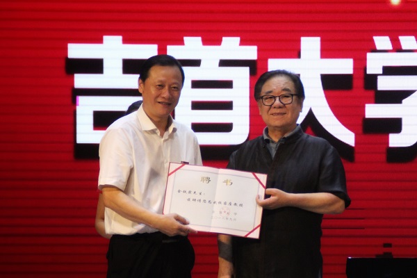 图为白晋湘校长为金铁霖教授颁授客座教授证书