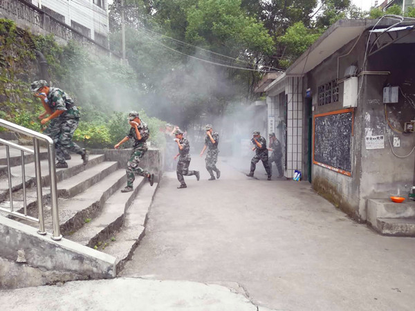 疏散信号吹响,统一燃放烟雾弹,新生正式开始模拟逃生。在演练的过程中,所有新生都用自备的毛巾捂住口鼻,低头弯腰,在工作人员的指导下迅速有序的疏散撤离。