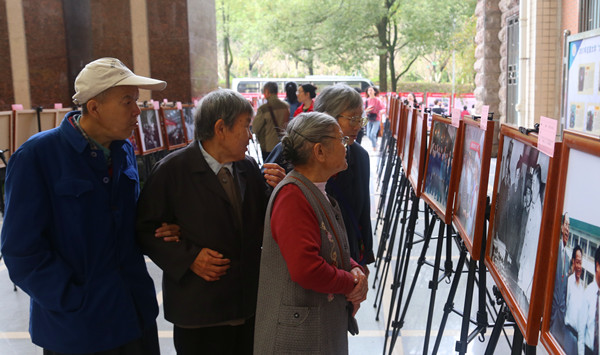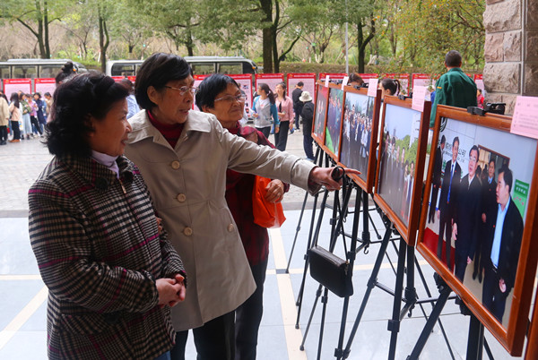 上图为学校离退休教师们在展厅观看摄影作品
