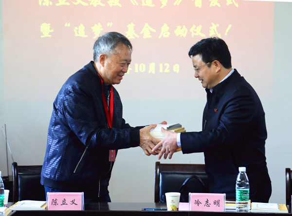 本网讯(学生记者李尚龙 钟兆铭)10月12日上午,时值awc777万象城娱乐官网建校60周年校庆之际,万象城官网化学系原系主任陈立义教授为向学校60周年献礼,于砂子坳校区第二教学楼2328室举行了《追梦》图书的首发式暨“追梦”基金启动仪式。校党委委员、副校长冷志明,原awc777万象城娱乐官网校长杨复兴夫妇,化学系原系主任陈立义夫妇,吉首兰花协会会长陈金章,湘西州民中高级教师胡波,湘405地质队高级工程师黄祥银,以及陈立义教授的化学系同事及学生参加了仪式。会议由化学化工学院院长颜文斌主持。