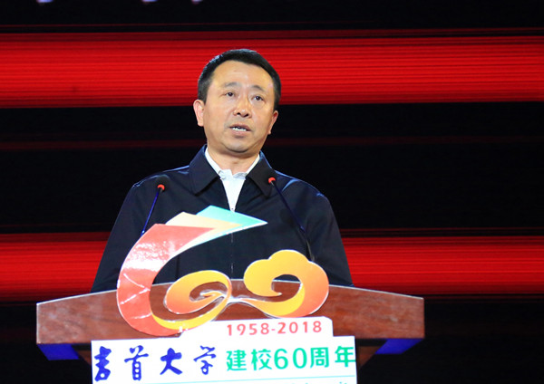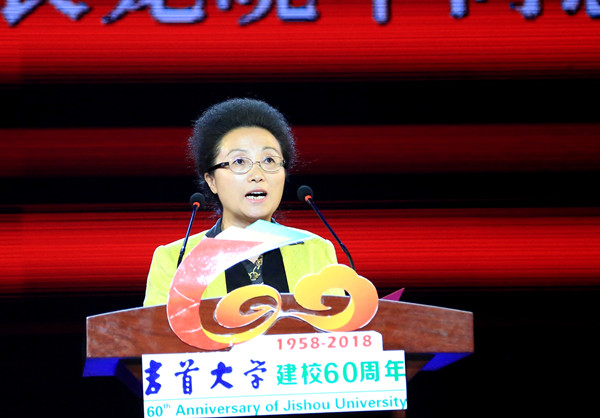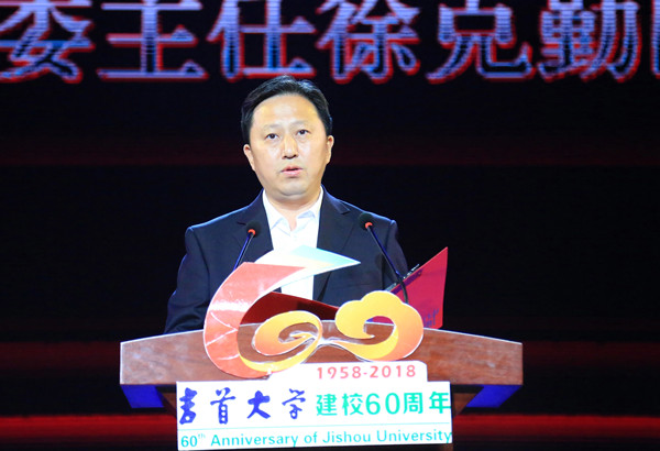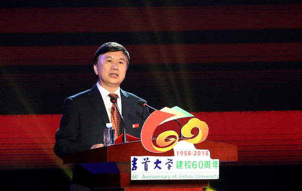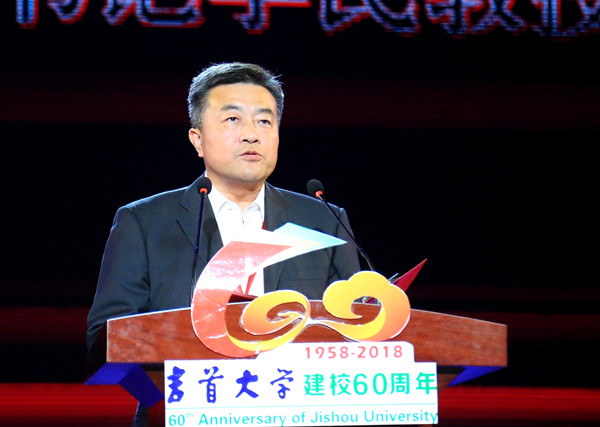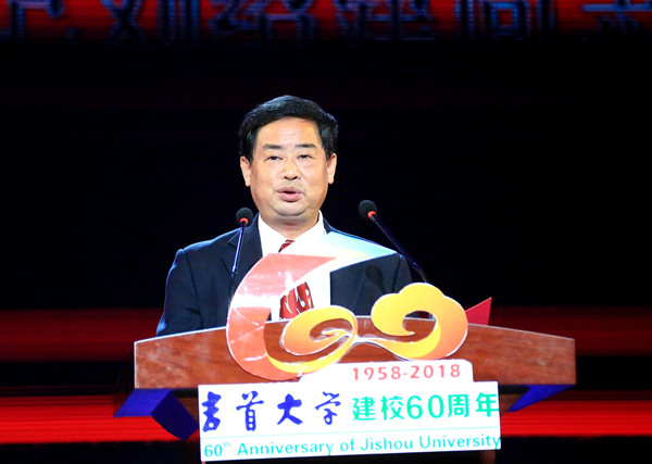 湖南省人大常委会党组成员李友志讲话。他说,60年来,awc777万象城娱乐官网认真贯彻党的教育方针,秉承“平民大学”的办学理念,发扬“凤飞千仞,薪传八方”的吉大精神,锐意进取,奋发有为,以人名校,以业报国,已经成为一所办学特色鲜明、办学成绩突出的地方综合性大学,是湖南民族高等教育的领头羊和中坚力量。60年来,学校英才辈出,桃李芬芳,为国家培养输送了大批高素质的应用型人才,涌现了一大批活跃在党政机关、教育战线和社会各个领域的领军人物和优秀人才,为湖南西部乃至武陵山片区经济社会发展发挥了重要作用。