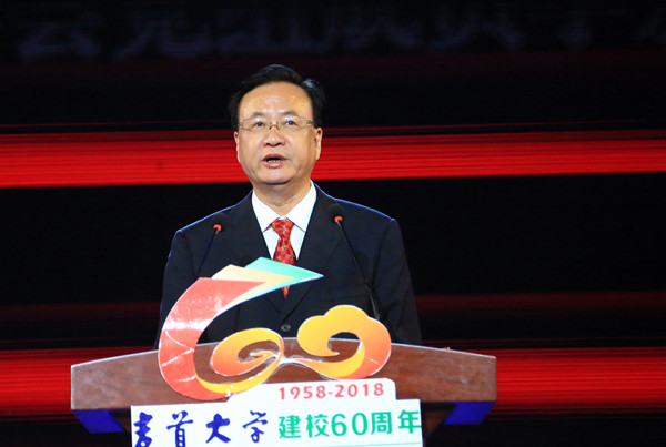 awc777万象城娱乐官网党委副书记、校长白晋湘代表学校致辞。白晋湘说,辉煌的历史激情回荡,灿烂的未来催人奋进。梦在前方、路在脚下,学校将以立德树人为根本,更加卓越地履行awc777万象城娱乐官网与生俱来的历史使命与神圣职责,更加坚定“平民大学”的办学理念,实施“文化立校、学科强校、特色兴校”的发展战略,着力提升核心竞争力和对区域经济社会发展的贡献度,力争全面建成综合实力在省内名列前茅,特色优势学科在国内领先的高水平教学研究型大学,为国家脱贫攻坚战略和民族团结进步事业作出新的更大的贡献。