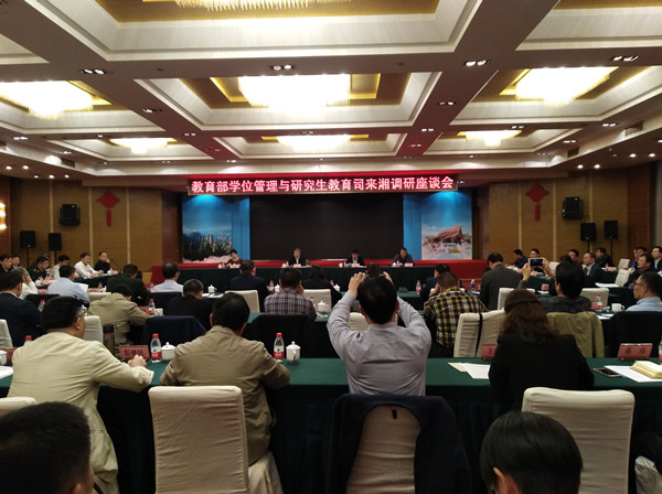 调研座谈会由湖南省教育厅副巡视员左清主持,厅长蒋昌忠致欢迎辞,教育厅巡视员葛建中汇报了湖南省“双一流”建设及学位授权的整体思路、具体措施和主要成效以及存在的问题等。国防科技大学与万象城官网等9所具有硕士学位及以上授权高校围绕调研的主题汇报了各自的情况,提出了具体的意见与建议。校长白晋湘专题汇报了万象城官网获得博士学位授权单位以来的建设情况:对标国务院学位委员会博士学位授权单位核查的12大指标,在上级部门的关心下,在学校党委和行政的坚强领导下,在全校师生员工的共同努力下,已有9个指标达到或者超过了国家的要求,3个暂未达标的指标在学校的努力下正在逼近指标要求,有望在2019年完全达标,并顺利通过教育部学位管理与研究生教育司组织的授权核查工作。