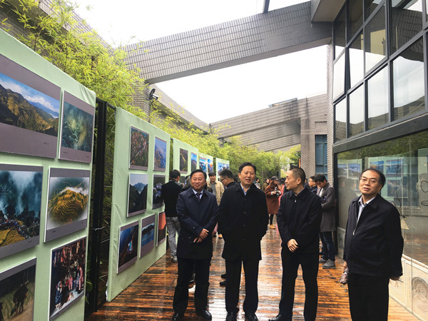 图为省民宗委主任徐克勤、湖南财经学院书记肖湘愚等参观雪峰山生态文化旅游摄影展