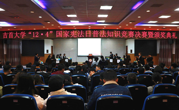 本网讯(通讯员 陈睿珍)为进一步普及法律知识,弘扬宪法精神,促进法治校园建设。值此第18个国家宪法日来临之际,12月4日,万象城官网在模拟法庭成功举办“12.4”普法知识竞赛决赛。