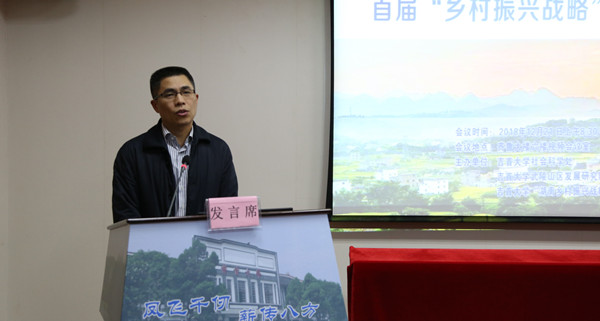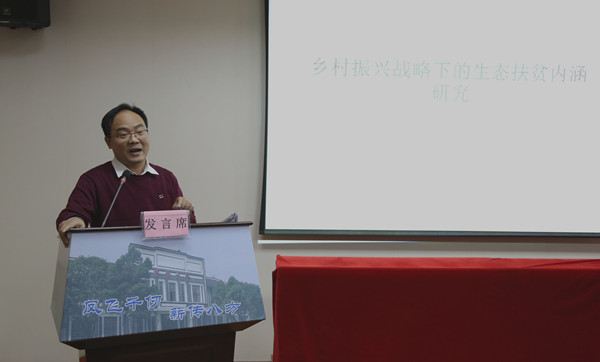 教师代表吴合显作论文分享发言,他以“乡村振兴战略下的生态扶贫内涵研究”为主题,向大家讲述了他在乡村振兴研究方面的独特观点。