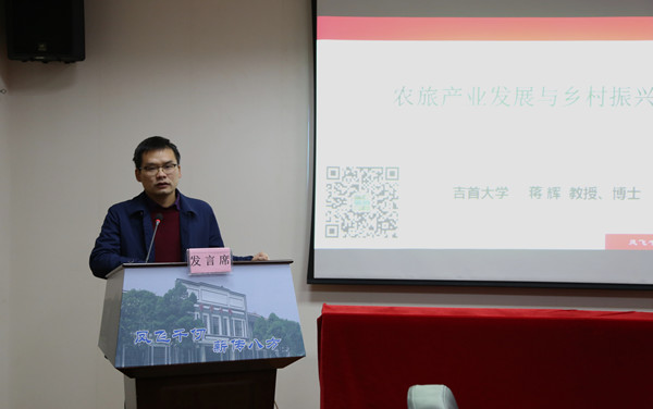 会上,蒋辉博士作“农旅产业与乡村振兴”的主题报告。他以陕西省札泉县袁家村的发展实际为范例,向大家介绍了“梦幻花园”、“深山氧吧”、“四季果园”、“清心小筑”等十余种农村旅游产业发展模式,最后提出乡村的振兴源动力在于政府,政府应充分发挥调控措施,推动农旅产业的发展。