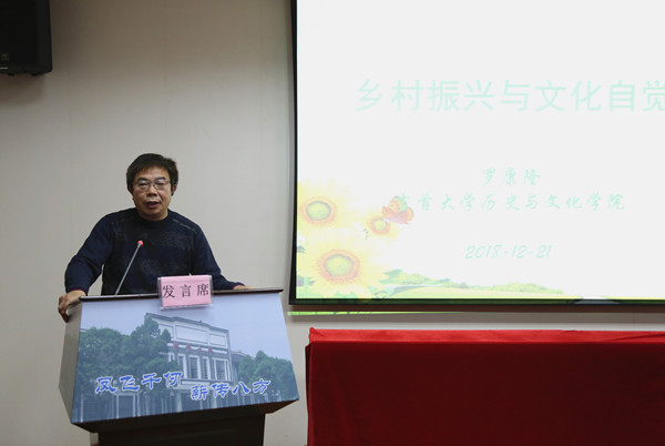 历史与文化学院院长罗康隆作“乡村振兴与文化自觉”的主题报告。他指出当前乡村振兴思路大部分停留在娱乐方面,应充分重视文化自觉对于乡村振兴的积极作用。在乡村振兴中,乡民是主体,民间文化是凭依,产业是归宿,乡村之景是振兴发展的舞台,只有综合以上元素,才能够演出一场优秀完美的乡村振兴大戏。