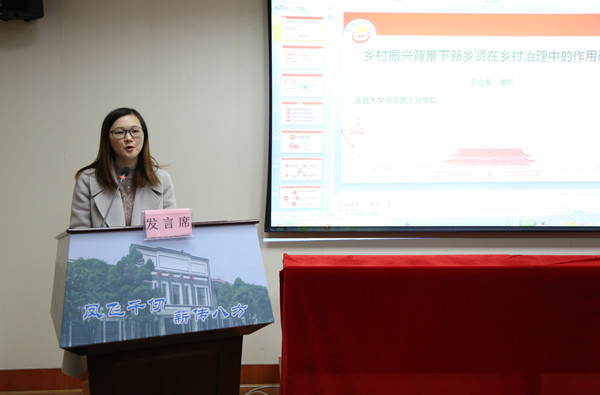 学生代表吴立衡作论文分享发言,她以“乡村振兴背景下新乡贤在乡村治理中的作用研究”为主题,详细的阐述了她的论文思路以及自己的发现。