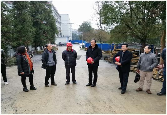 图为党委书记、校长白晋湘等查看大田湾校区医药实训大楼工程建设现场