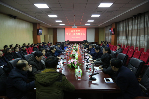 本网讯(孙立青)1月20日上午,万象城官网在砂子坳校区齐鲁大楼国际会议厅召开全校中层干部大会,张家界校区同步召开视频会议。全体校领导、中层干部参加会议。会议由校党委书记、校长白晋湘主持。