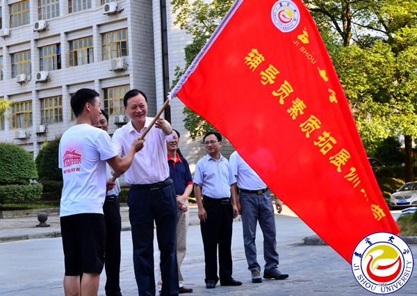7月27日上午8点,出征仪式在图书馆前隆重举行。校党委书记游俊,校党委副书记、校长白晋湘,党委委员、副校长龙先琼、王绯及校办、宣传部、人事处、学工部、校团委等相关部门负责人出席仪式。仪式由学工部部长周华忠主持。