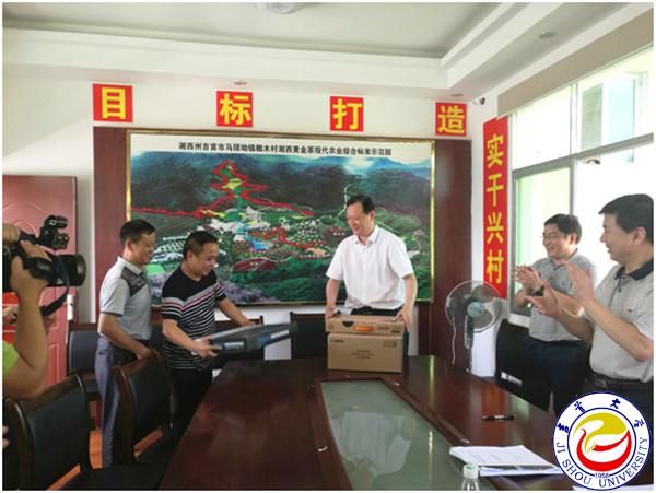 图为白晋湘校长代表学校向榔木村赠送办公设备