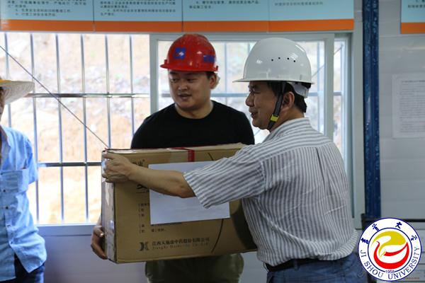 图为游俊书记为施工人员发放防暑降温用品 翁凯摄