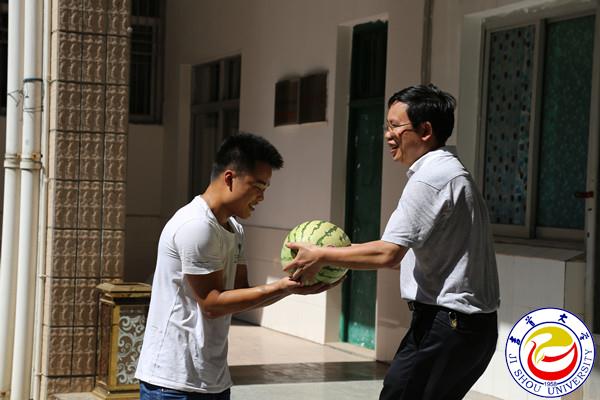 图为黄昕副校长为工作人员送上降温水果 翁凯摄