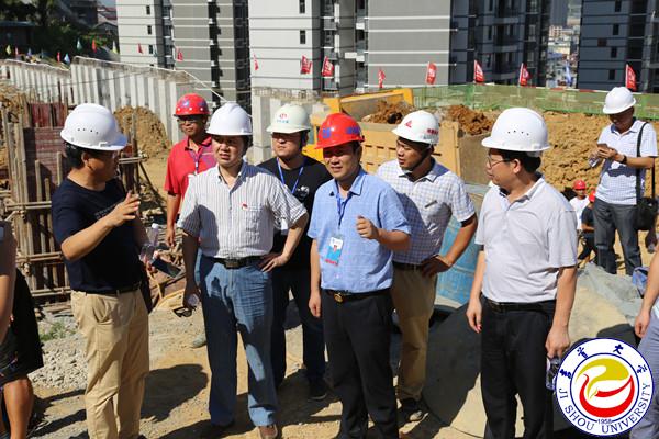 图为校领导冒酷暑在施工现场调研 翁凯摄