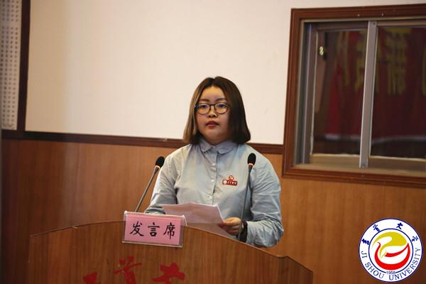 图为外国语学院党委学生第一党支部书记冯蕾同学代表先进基层党组织发言 翁凯摄