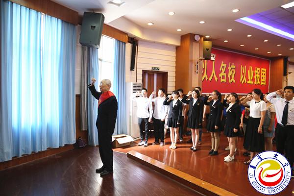 面向鲜红的党旗,17名师生预备党员在离休干部、优秀共产党员李泽南同志的带领下重温入党誓词,立下忠诚于党的铮铮誓言,表达了为党的事业奋斗终身的决心和愿望。