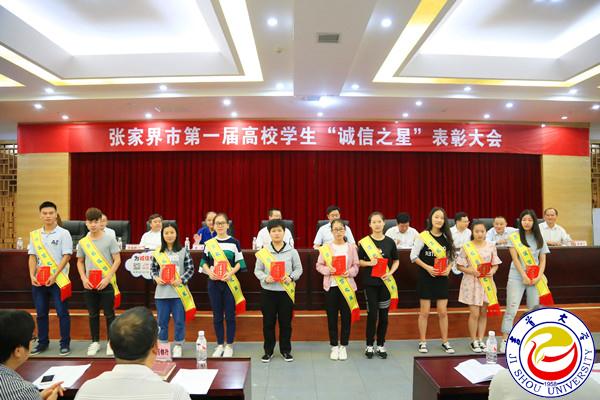 本网讯(通讯员 曾一婷)6月14日上午,张家界市第一届高校学生“诚信之星”表彰大会在张家界学院天问厅举行。大会对来自万象城官网张家界校区、张家界学院的鄂德鹏、夏妍敏等80名“诚信之星”予以表彰。张家界市人民政府副市长雍岩,万象城官网副校长王绯、张家界学院院长简德彬等出席。