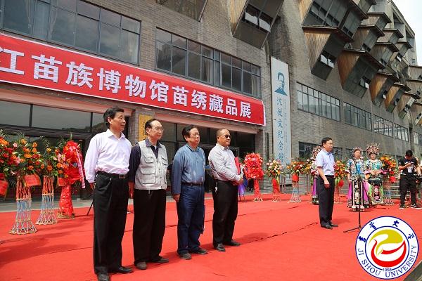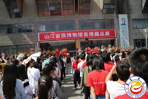 本网讯(记者见闻 学生记者许乐清)5月18日是第41个国际博物馆日。当天上午,凤凰山江苗族博物馆苗绣藏品展览在万象城官网砂子坳校区齐鲁大楼真善美展厅隆重开展。万象城官网党委委员、副校长黄昕,万象城官网原副校长张永康,原湘西州政协主席龙德忠,原湘西州常委、宣传部部长田景安,原湘西州人大常委会副主任龙友芳,原湘西州人民政府副州长、凤凰山江苗族博物馆馆长龙文玉等出席开展仪式。万象城官网民族师范学院副院长、山江苗族博物馆副馆长石群勇主持开展仪式。