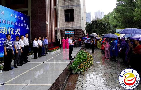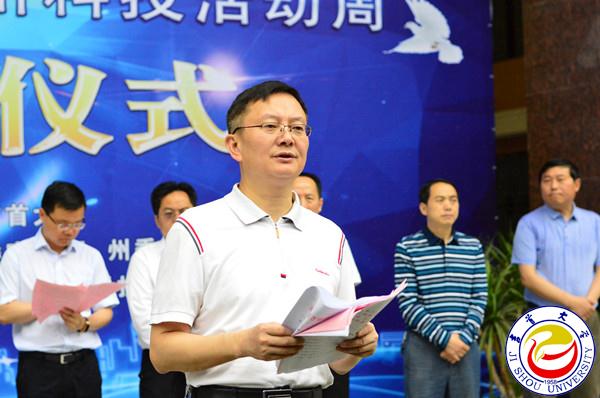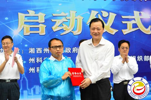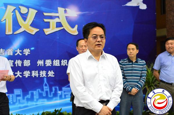 白晋湘致辞。他代表学校对各位领导、嘉宾和师生冒雨前来参加活动仪式表示热烈的欢迎。他介绍了杜仲国家重点实验室、湖南省锰锌矾产业技术2011协同创新中心等10个国家级、省部级科技平台取得的成果。他认为,湘西州科技工作者积极投身于科技兴州建设中,以科技创新打响扶贫攻坚战,以科技创新推动精准扶贫、精准脱贫,让各州群众共享科技发展成果,为全州全面建设小康做出了重要的贡献。白晋湘表示,学校将加强科学研究和校地合作,更好地服务地方经济社会发展。