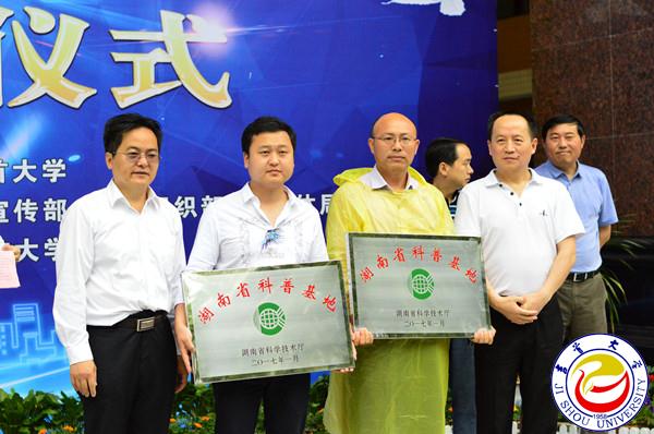 图为钟海平副校长和刘小刚副主任为湘西州第十一批省级科普基地授牌