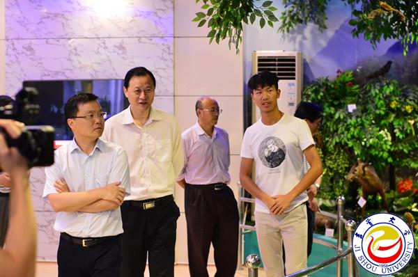 仪式结束后,与会领导嘉宾参观了刚评选为湖南省级科普基地的武陵山生物科学馆。武陵山生物科学馆成立于2015年12月,包括了武陵山植物馆、武陵山动物馆和武陵山动物多样性3个分馆。馆内珍藏各类动植物标本2000余种,包括国家一级保护动物云豹标本,国家二级保护动物、曾经被宣布灭绝的阳彩臂金龟标本。