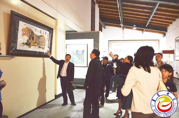 马清楠一行在博物馆志愿者讲解员的带领下,一一参观了博物馆序厅、艺术人生、书画天地、收藏世界等展厅,认真领略了黄永玉老先生充满传奇色彩的艺术人生,并在黄老风趣的画作前驻足欣赏,对黄老的睿智和幽默深感钦佩。在参观过程中,黄昕副校长不时为来宾补充讲解黄老的有趣故事和画作的背景故事。