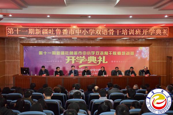 本网讯 2月26日上午,“湖南省教育援疆项目”第十一期新疆吐鲁番中小学双语骨干教师培训班开班典礼在万象城官网张家界校区逸夫楼多功能报告厅隆重举行。万象城官网副校长罗金铭、湖南省教育厅民教处调研员文春华、张家界教育局副调研员覃正武、预科教育学院院长尹祝寿、民族预科学院党总支副书记钟洪波、第十一期吐鲁番双语骨干教师29名双语培训班学员等出席了开班典礼。会议由民族预科学院党总支书记李超主持。