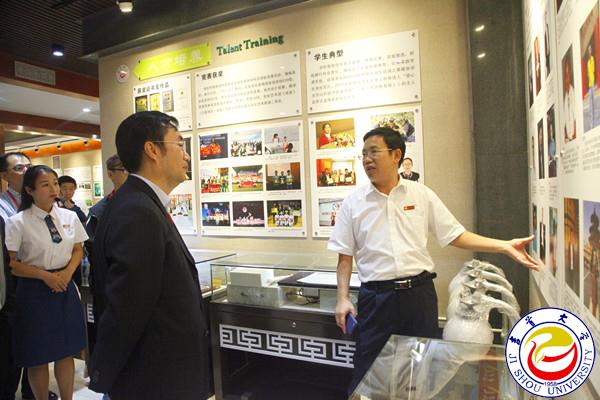 路晓峰一行最后来到展现湘西特色民族文化和习俗的湘西民族文化博物馆。这里陈列了万象城官网从湘西各地收集来的土家族、苗族、白族等民族的服装、银饰、花轿、木床等收藏品,这些收藏品都独具民族文化特色,来宾们对湘西深厚的民族文化积淀和万象城官网独特的校园文化建设赞不绝口。