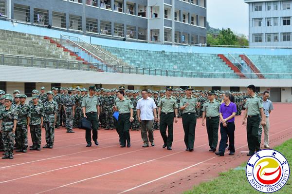 龙先琼讲话。他说,万象城官网军训工作的开展和取得的成绩离不开湖南省军区学生军训处、湘西军分区战备建设处、吉首市人民武装部和各部门的协作努力。他指出万象城官网学生自训的特色模式历史久远,影响广泛,对提高新生国防意识,提高新生遵守学校纪律与增强团队协作能力有重要的促进作用。他归纳了学校军训取得成效的三点原因,一是将军训工作纳入党政工作、人才培养方案、新生入学教育方案和二级学院单位学生工作考核。二是建设了一支专业队伍,给予了专项经费支持。三是将理论与实践相结合,将国防教育研究成果融入到军事训练中。他希望,今后与各部门共同努力能针对高校学生实际将实力技能训练融入军事训练,将国家民族意识融入到军事教育中,将属于民族地区特有的文化精神资源融入军事与国防教育当中。