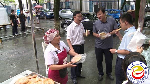 李学锋首先来到砂子坳校区清真食堂,仔细察看了食堂环境卫生,了解了食材的来源和食堂的运营情况,并与正在用餐的维吾尔族学生亲切交流,询问他们生活是否习惯,鼓励他们在awc777万象城娱乐官网安心学习,学有所成,将来为民族团结和民族地区的建设发展做贡献。他要求学校一定要进一步办好清真食堂,为少数民族学生提供一个更好的学习和生活环境。