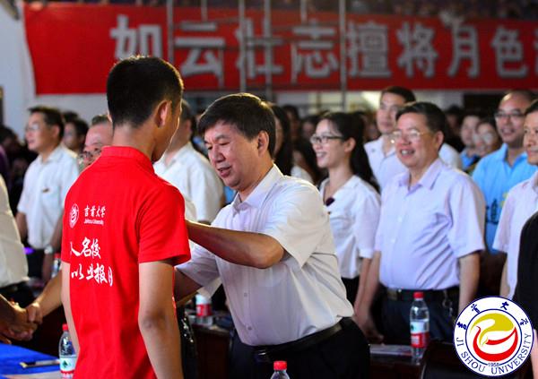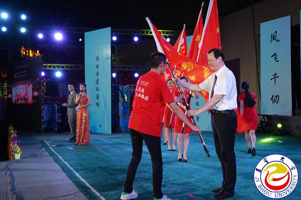 图为白晋湘校长给各学院新生授旗 见闻摄
