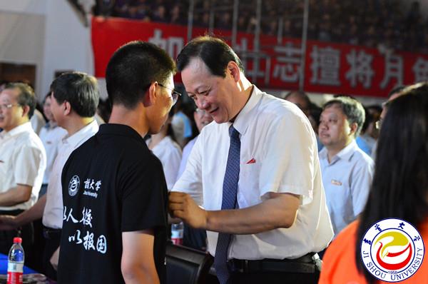 上图为校领导为新生佩戴校徽 孙立青摄