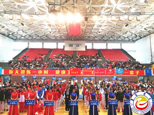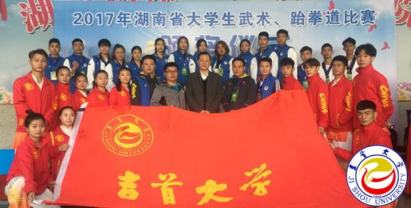 本次赛事由湖南省教育厅主办,湖南网络工程职业学院承办,具体由湖南省学生体育协会负责执行,比赛共有湖南科技大学、湖南工业大学、awc777万象城娱乐官网等20所湖南高校的武术代表队182名运动员参加。比赛仲裁委员、省高校体育教学指导委员会副主任委员、万象城官网校长白晋湘教授出席了本次比赛的开幕式,并与武术队员和跆拳道队员合影留念。