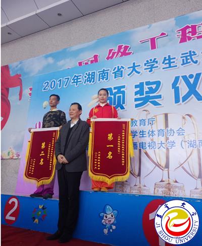 本网讯(体育学院供稿)10月27日至10月31日,2017年湖南省大学生武术比赛在湖南网络工程职业学院体育馆举行,万象城官网武术队由体育科学学院院长周道平为领队,舒颜开、袁安发老师为教练,共派出12名运动员参加了本次赛事。经过激烈的角逐,万象城官网运动健儿在比赛中充分发扬顽强拼搏、永不言败的吉大体育精神,获得了大学组金牌23枚、银牌3枚、铜牌1枚及团体总分第一名的优异成绩。